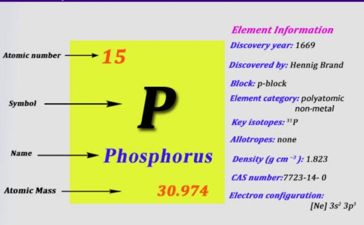 Phosphorus is a chemical element with the symbol P and atomic number 15. Elemental phosphorus exists in two major forms, white phosphorus and red phosphorus, but because it is highly reactive, phosphorus is never found as a free element on Eart